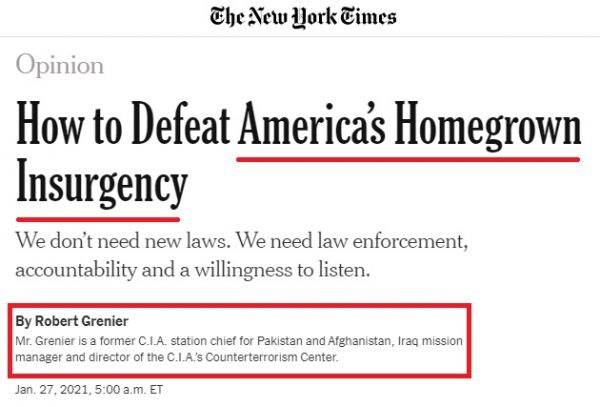 The New York Times on Wednesday ran an article from “former” top CIA officer Robert Grenier labeling dissenters as part of a terrorist “insurgency” and calling for them to be “defeated” like an enemy army.