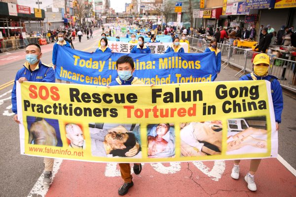 Falun Gong practitioners take part in a parade in Flushing, New York, on April 18, 2021, to commemorate the 22nd anniversary of the April 25th peaceful appeal of 10,000 Falun Gong practitioners in Beijing. (Samira Bouaou/The Epoch Times)