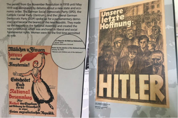 While walking the halls, I read a few newspaper headlines, one that said “Madchen u. Frauen, heraus, aus ver Finsternis!” Which translated means, “Women and children out of the darkness! The other said, “Unsere letzte Hoffnung: Hitler.” which says “Our last hope. Hitler.” I found it interesting that we are hearing similar things today from our politicians and the like.