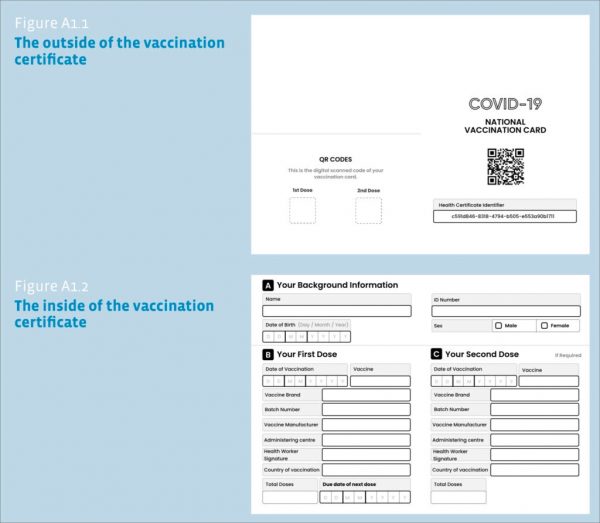 The document also shows its proposed vaccine passport template, with a QR code featured on the front, but further in the app shows personal information about the number of vaccines received.
